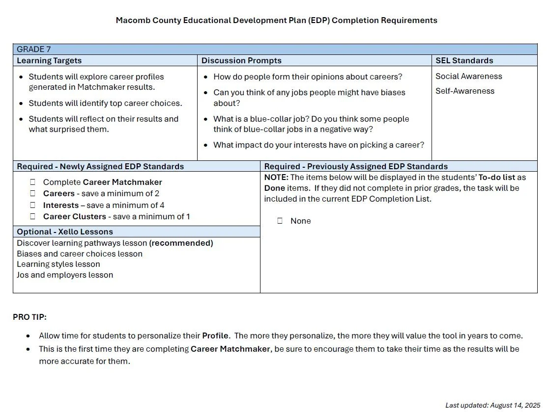 To assist local school districts guide their students through their EDP the Macomb Intermediate School District has assembled Xello EDP Completion Standards for grades 6-12. This document can be used to plan a students journey and build upon the previous years work.